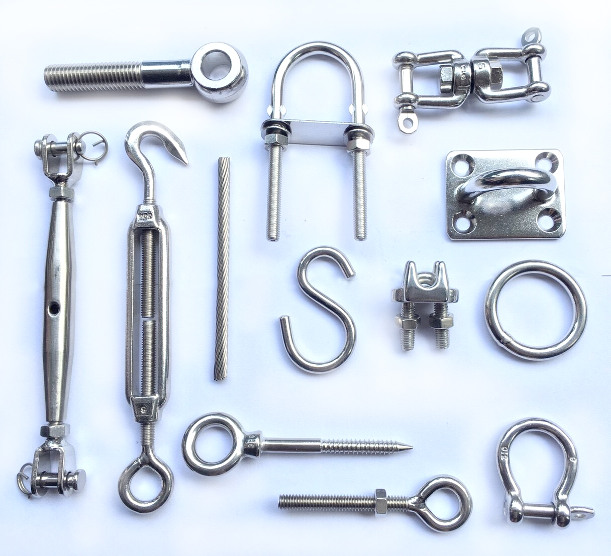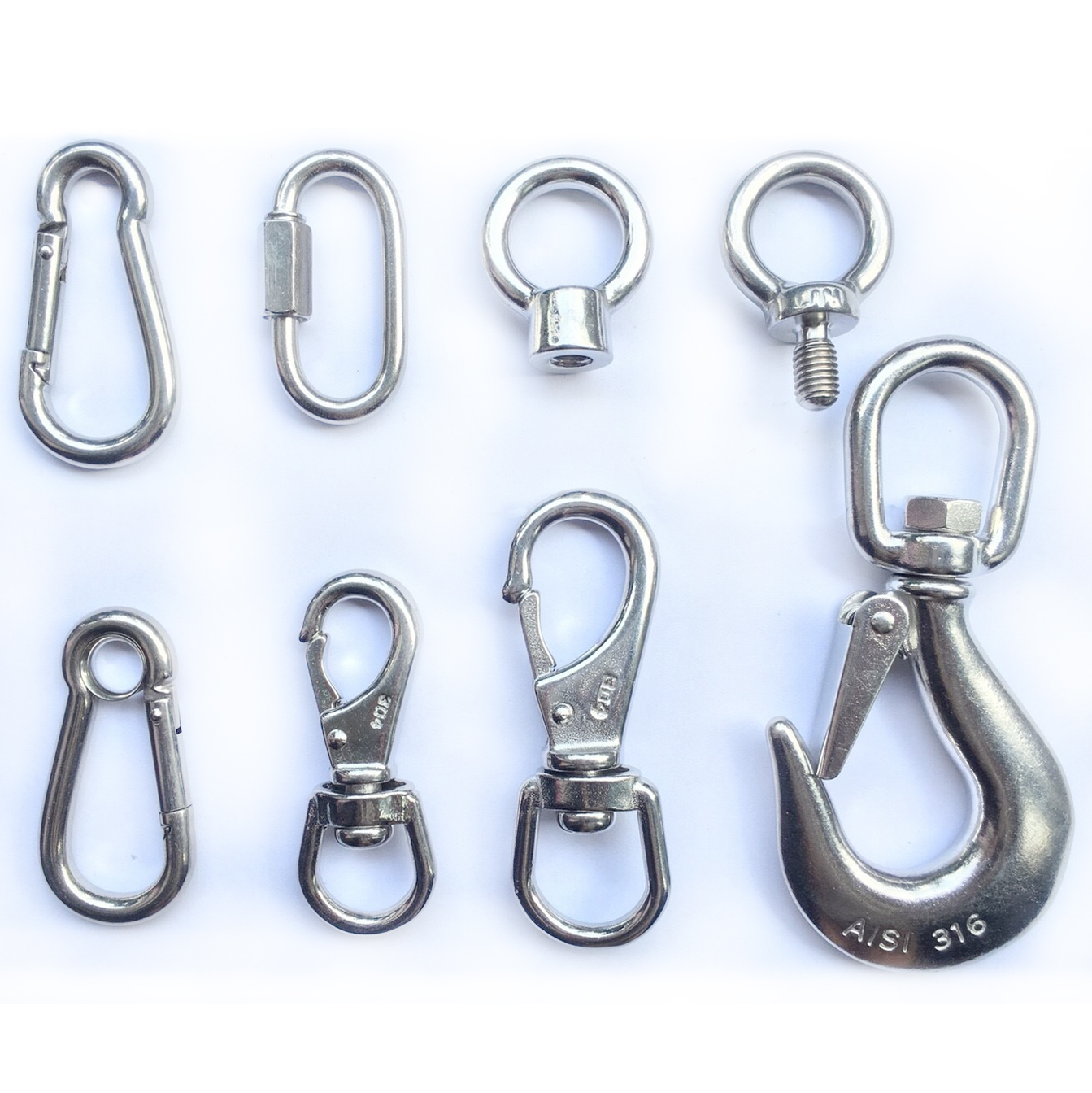 - อุปกรณ์ลวดสลิงสเตนเลส (Stainless rigging) เช่น กิ๊ปจับสลิง สเก็นยกของ สเก็นต่อโซ่สมอ เกลียวเร่ง ตะขอยกของ ห่วงกลม พวงกุญแจ ห่วงหัวใจ (Thimbles) มาสเตอร์ลิงค์ 304 และ 316